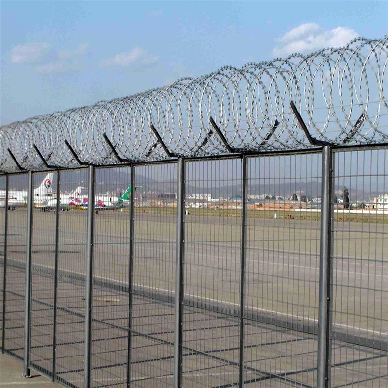 度和安全防御性級(jí)別很高的隔離柵產(chǎn)品。近年來,被廣泛應(yīng)用在機(jī)場(chǎng),軍事基地等高安全場(chǎng)所。注:如果在機(jī)場(chǎng)隔離柵頂部加裝刀片刺絲、刀