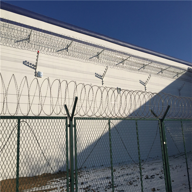 看守所鋼網(wǎng)墻-巡道防護(hù)網(wǎng)上部會安裝刀片刺網(wǎng)(刺絲滾籠),刀片刺網(wǎng)具有嚇阻、防翻越的效果,材質(zhì)堅硬,高強(qiáng)度,高張力,造型設(shè)計獨特,不宜觸摸,因而能達(dá)到很好的防護(hù)隔離效果。看守所隔離柵欄-巡道防護(hù)網(wǎng)還具有施工簡便,經(jīng)濟(jì)實用等優(yōu)點.