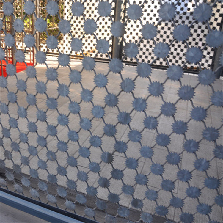 1、梅花刺片:梅花刺片直徑不小于7.5cm(直徑6cm、7cm、8cm),刺片厚1.5mm,采用Q235低碳鋼板沖壓成型。梅花刺片用氬弧焊將梅花形刺片焊接在美格網的節(jié)點上,形成刺形保護,有效的防止了手握腳攀。