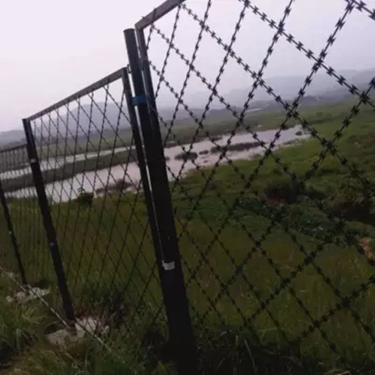 5、監(jiān)獄鋼網(wǎng)墻具有防腐、防老化、防曬等特點。螺旋型交叉刀片刺網(wǎng)是在兩條刀片刺網(wǎng)之間以不銹鋼片和鍍鋅鋼片強力夾扣,展開后即呈交叉狀,美觀又實用。