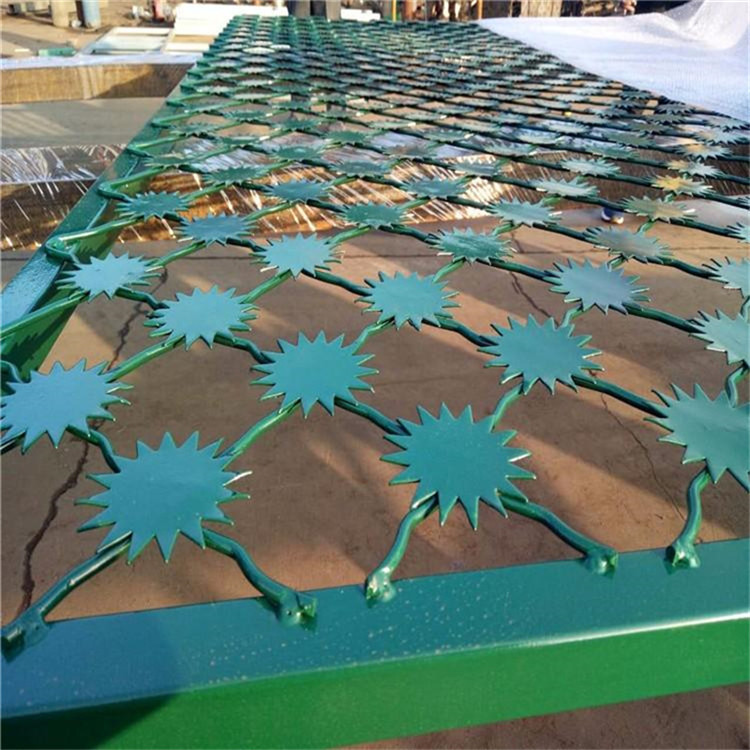 1、梅花刺片:梅花刺片直徑不小于7.5cm(直徑6cm、7cm、8cm),刺片厚1.5mm,采用Q235低碳鋼板沖壓成型。梅花刺片用氬弧焊將梅花形刺片焊接在美格網(wǎng)的節(jié)點(diǎn)上,形成刺形保護(hù),有效的防止了手握腳攀。