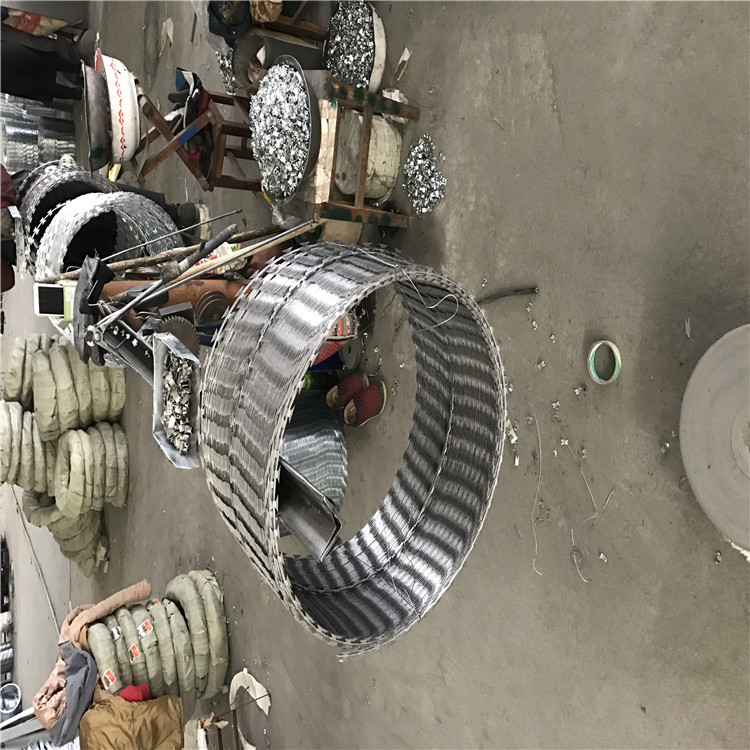 不銹鋼刀片刺繩是一種近年發(fā)展起來的防護、隔離能力較強的新型防護網產品。它采用鋼板沖壓成型包附于鋼絲之上,由銳利尖角鍍鋅鋼板或不銹鋼薄板做刀片,高張力鋼絲做芯線組合而成的。常見圈經500mm、600mm、800mm,其它規(guī)格也可定制。根據形狀可分為:螺旋式-刀片刺網、交叉式-刀刺網、平板式-刀片刺網、直線式-刀片刺網。被廣泛應用在監(jiān)獄,機場,軍事基地等高安全場所。