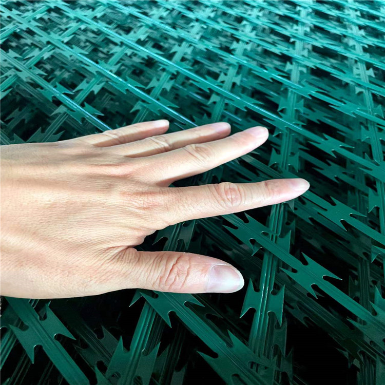 特點:焊接刀片刺網(wǎng)又名菱形刀刺網(wǎng),是一種近年發(fā)展起來的防護、隔離能力較強的新型防護網(wǎng)產(chǎn)品。它采用鋼板沖壓成型包附于鋼絲(筋絲)之上,由銳利尖角鍍鋅鋼板或不銹鋼薄板做刀片,高張力鋼絲做芯線組合而成的。鋒利的刀型刺由雙線扣裝后成蛇腹?fàn)?,既美觀又讓人不寒而栗。起到了很好的阻嚇作用。
