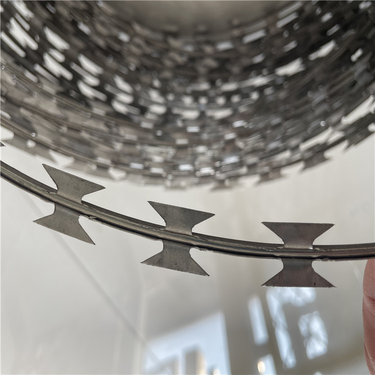固定支架是我們加工好的,底部有固定底座。使用手持式固定鉆把支架固定在需要的合適位置,一般相隔2. 5m或者3m固定-一個(gè)。接下來(lái)就是把拉線設(shè)置好,每個(gè)支架的單臂上面有固定點(diǎn),每側(cè)可設(shè)置兩道或者三道。拉線固定就是刀片刺網(wǎng)了,刀片剌網(wǎng)拆下包裝帶好防護(hù)手套,根據(jù)自己需要的密度把刀片刺網(wǎng)放在固定拉線上面,用鍍鋅卡扣固定好。以上就是所有的安裝步驟及方法。