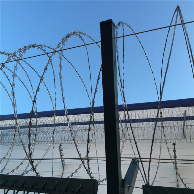 螺旋交叉型刀片刺繩是相鄰的兩圈刀片刺繩交錯用卡扣連接到一起,展開后即成交叉狀,大大縮短了兩環(huán)之間的空隙,更好的起到了防護作用,安裝過程中需要在刀片刺繩圈內拉鋼絲,以便起到更好的穩(wěn)固作用。 螺旋交叉刀片刺網比螺旋單一型刀片刺網安全級別更高,螺旋交叉刀片刺網被廣泛應用于工業(yè)安全,中低級別設防的監(jiān)獄。螺旋交叉刀片刺網可是加工成不同外徑規(guī)格(450mm、600mm、700mm、900mm),刀片類型和規(guī)格可根據客戶的實際需求量身定做。通常用于生產交叉型的有BTO-10、BTO-22。