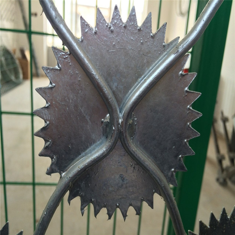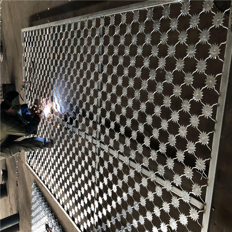 監(jiān)獄帶剌的隔離網(wǎng)網(wǎng)片、立柱要求整體熱鍍鋅,上鋅量不低于100克,可做霧化試驗(yàn)(附檢測報告) ,護(hù)欄網(wǎng)整體鍍鋅在內(nèi)陸自然環(huán)境下,鋅層要求使用不低于10年。監(jiān)獄太陽花隔離網(wǎng)看守所梅花刺美格網(wǎng)護(hù)欄