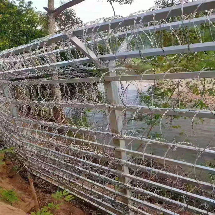 是一種近年發(fā)展起來(lái)的防護(hù)、隔離能力較強(qiáng)的新型防護(hù)網(wǎng)產(chǎn)品。它采用鋼板沖壓成型包附于鋼絲(筋絲)之上,由銳利尖角鍍鋅鋼板或不銹鋼薄板做刀片,高張力鋼絲做芯線組合而成的。鋒利的刀型刺由雙線扣裝后成蛇腹?fàn)睿让烙^又讓人不寒而粟。起到了很好的阻嚇作用。該產(chǎn)品具有美觀、防阻效果好、施工便利等優(yōu)點(diǎn)。