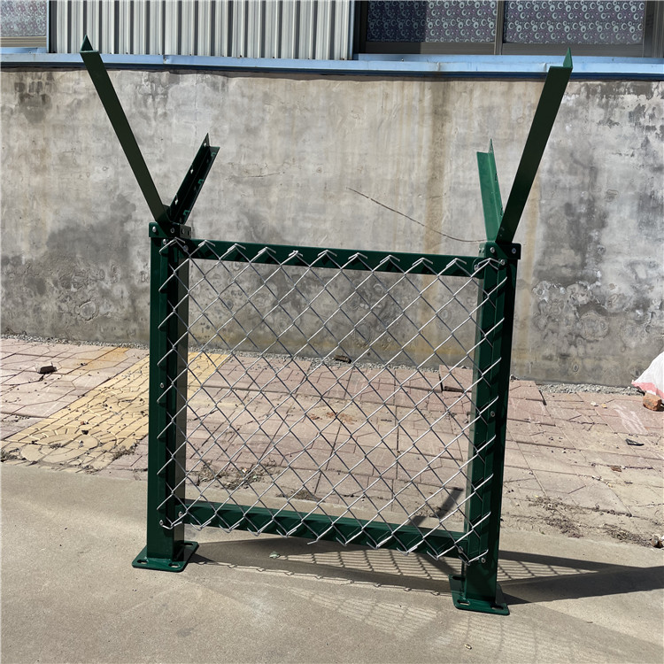 用在機場的鋼絲網(wǎng)圍界的樣子,墨綠色的Y型立柱,搭配50*100mm帶有折彎加強筋的堅固網(wǎng)片,立柱上部加裝蛇腹型的刀片刺繩,刀朋是經(jīng)特定的機子沖壓成型,特別鋒利,起到很好的震懾阻嚇的效果。