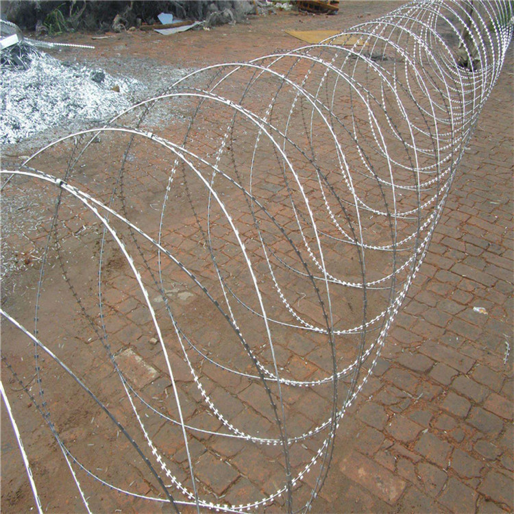 它采用鋼板(刀板)沖壓成型包附于熱鍍鋅鋼絲(芯線)之上,由銳利尖角鍍鋅鋼板或不銹鋼薄板做刀片,